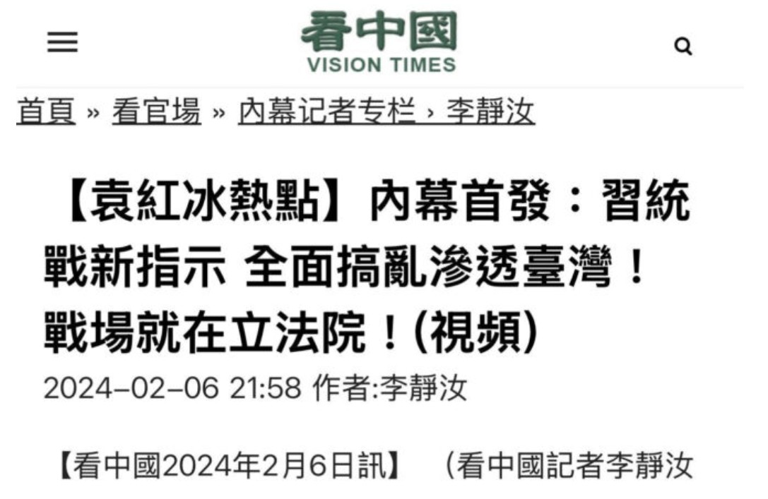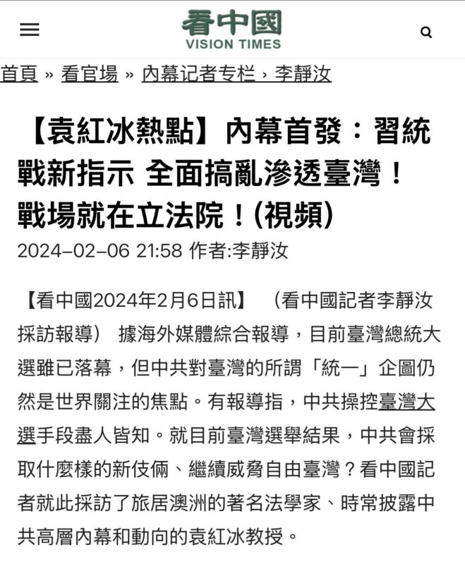 去年,1月中總統與國會大選,新任立委在 2月1日上任,5天後(2月6日)中國流亡學者袁紅冰在媒體表示,「習統戰新指示 全面搞亂滲透臺灣! 戰場就在立法院!」