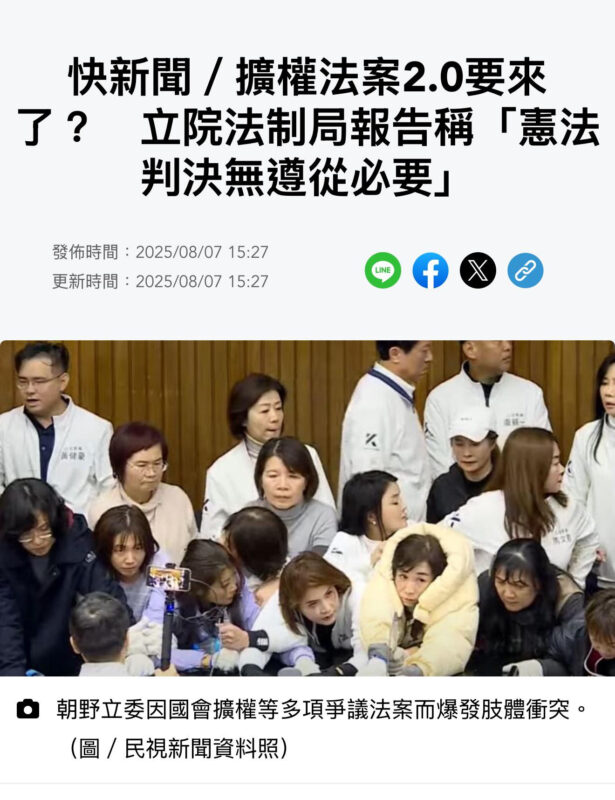 藍白癱瘓憲法法院後,又通過大罷免的試驗,他們正一步步把台灣帶往極權,昨天立法院法制局建議可以不甩憲法法庭判決,今天王鴻薇馬上就照做…