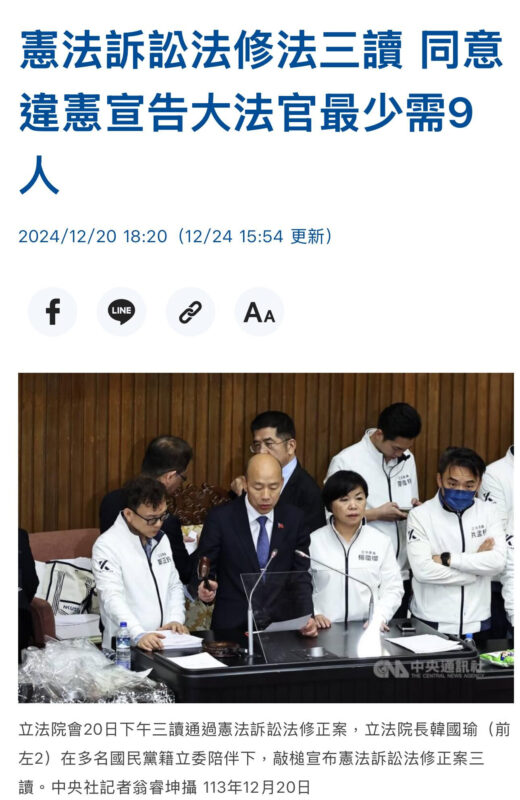 接著,國民黨跟民眾黨開始毀憲亂政,速度跟納粹黨顛覆威瑪一樣迅速,部分法律學者竟然還應和國民黨的行為,甚至成為立法院法制局「憲法判決無遵從必要」之引用來源,立法院法制局完全沒有身為民主憲政機關的基本認知!