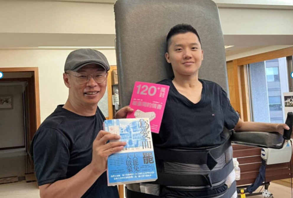 我邀請面面,趁轉換復健項目的空檔,一起拍了這張照片,併同分享他和家人五年來復健的努力,送給此刻所有正在為台灣努力行動、奮力拼搏的志工和公民。