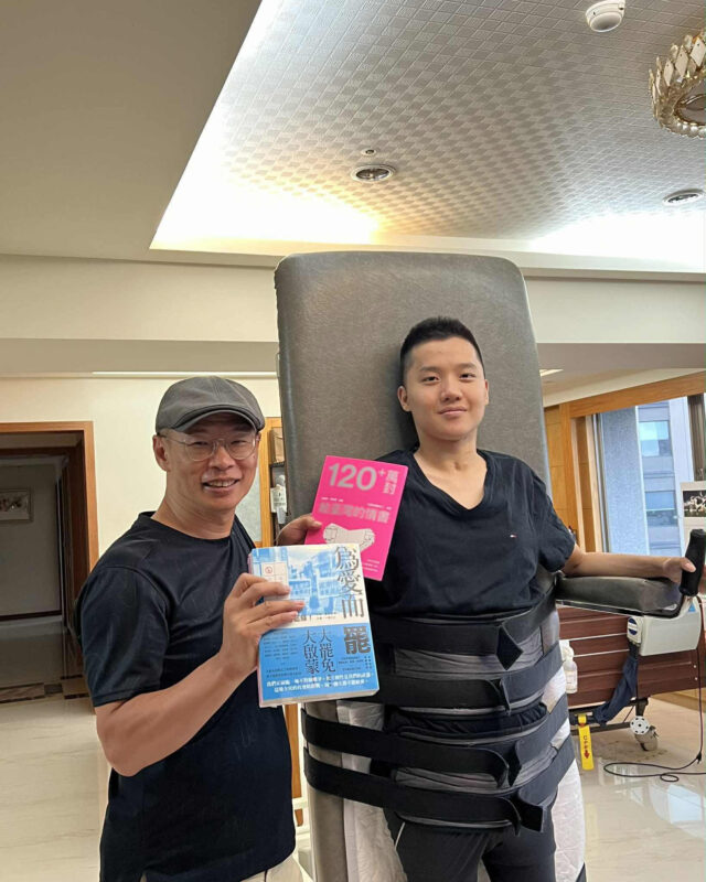 他在復健師一邊拍打時,一邊跟我聊天,但自己也沒閒著,不斷靠肩部神經帶動手臂做甩肩訓練,一做就是半小時、一小時⋯⋯接著再在家人護理人員協助移動到直立床,繼續做直立復健,就這樣,日復一日,面面連吃飯時都在做復健⋯⋯,每天超過10個小時的努力,他到現在左手知覺可以延伸到手掌弧口、右手到大手臂,背脊最近也有了突破,可以到肩頰骨附近。