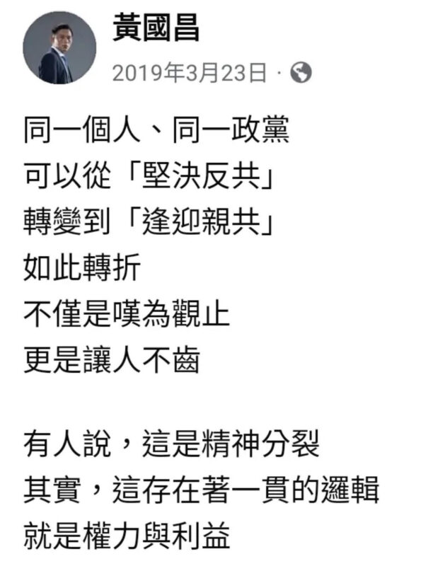看看黃國昌2019年3月23日的發文,他非常清楚他在幹嘛,他指責這樣立場的轉變,就是為了「權力」與「利益」。