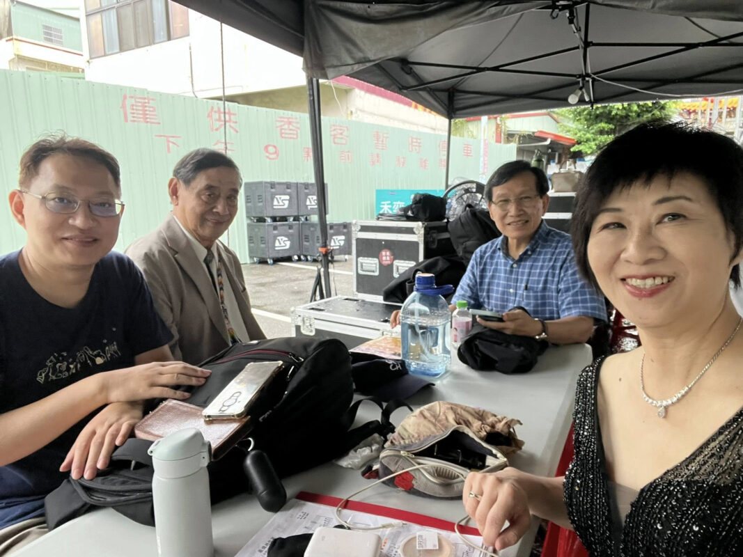 也必須誇獎一下演出的”基本咖”(如圖),有些小狀況臨危不亂(尤其鋼琴艾文老師),也始終在後台stand-by。很佩服高英傑前輩,高齡八十多歲,跟我們一起在後台待很久。走過白色恐怖的他,為的是能夠為捍衛民主自由而演唱。舞台外,有很多有意思的攤位,礙於穿著禮服,我一直不敢走出去,小小遺憾….