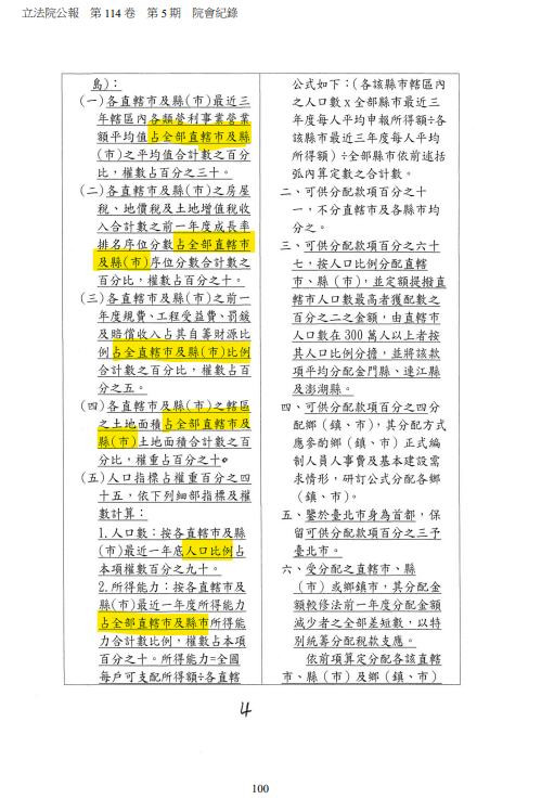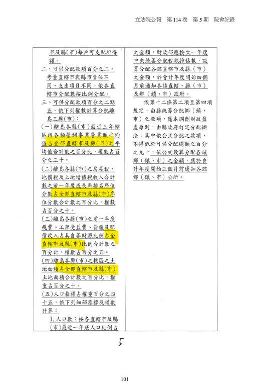 中國國民黨當晚提出的再修正動議條文,先區分本島19縣市分配普通統籌分配款的90.5%,離島3縣市分配2.5%,鄉鎮分配5%,最後2%由六直轄市依前分配比例再分配。二十二縣市各自具體分配公式,分子是各該縣市的企業營業額、土地面積等參數,分母卻是「全部直轄市及縣(市)」的對應參數。因此,假設22縣市的參數均相同,分配給本島19縣市的90.5%,會有3/22無法分配,分配給離島3縣市的2.5%,會有19/22無法分配。