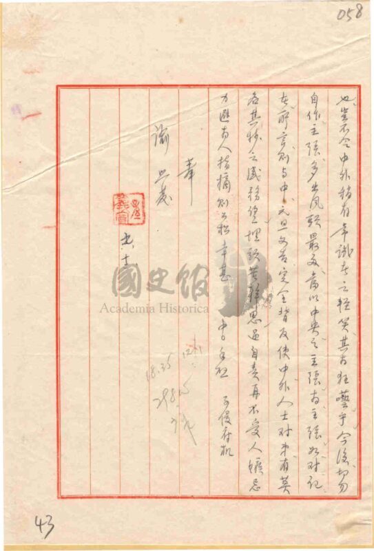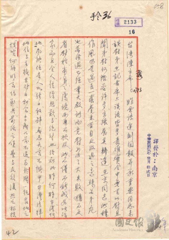 須知此時何時,台灣何地,尚能任吾人如往日放肆無忌,大言不慚乎。台灣法律地位與主權,在對日和會未成以前,不過為我國一託管地之性質,何能明言作剿共最後之堡壘與民族復興之根據也,豈不令中外稍有常識者之輕笑其為狂囈乎。今後切勿自作主張,多出風頭,……
