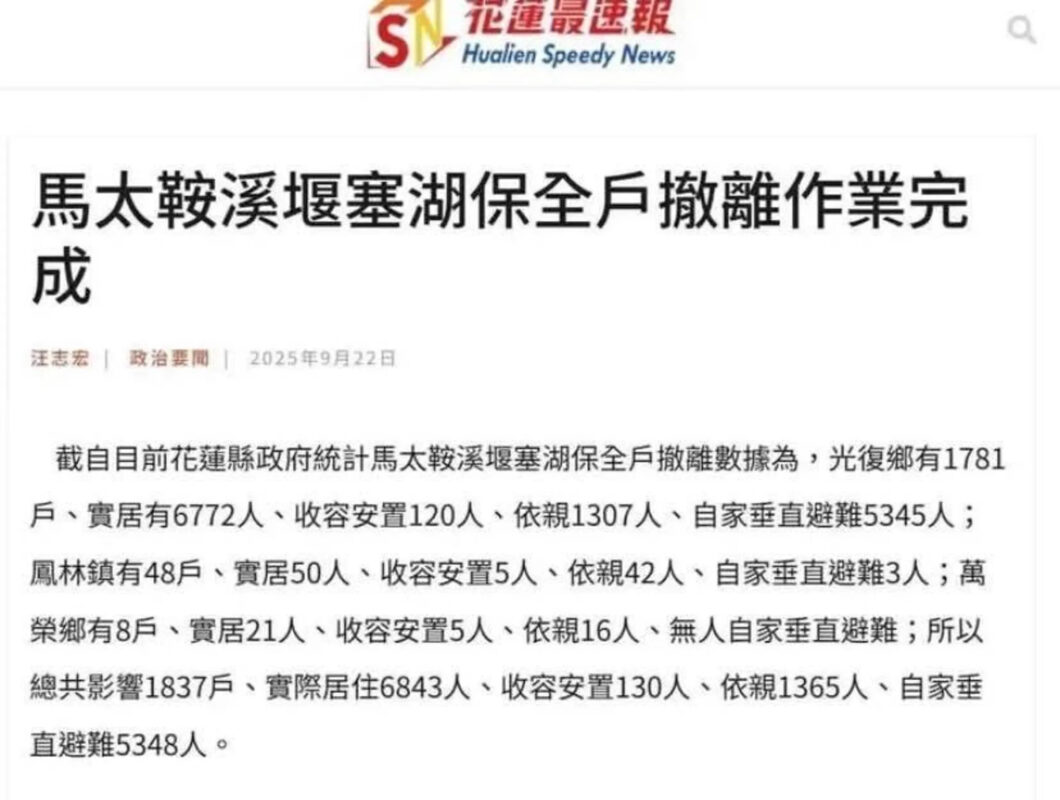 花蓮縣府後來又推說撤離人數短時間不斷激增,導致縣府來不及執行。不過,一份於9月22日發自花蓮縣府的〈馬太鞍溪堰塞湖保全戶撤離完成〉報導(如下圖)卻重重打臉上述說法。原來,事發前一天宣布撤離完畢,是要自我表功當政績;後來發現死了這麼多人,就改口宣稱地方政府執行撤離很困難。功勞你搶佔,責任絕不擔,官字兩個口,怎麼說都花蓮縣政府贏。