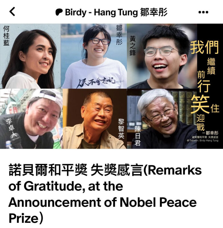 //「沒有得奬,但也感言。因為想多謝大家關心我們*,也關心香港的民主與人權。除了香港,在這世界上,哪裡有專制政權,哪裡就會有良心犯,請活在自由國度的人們,別讓世界各地監獄內外的良心孤獨地顫動,也希望各位同行者們,別~放~棄!只要良心在,光仍是會發熱發亮的。我們一起繼續前行,笑住迎戰,便會笑住煲底見!天祐María Corina Machado和委內瑞拉,願世上再沒有良心犯。多謝諾貝爾委員會。」