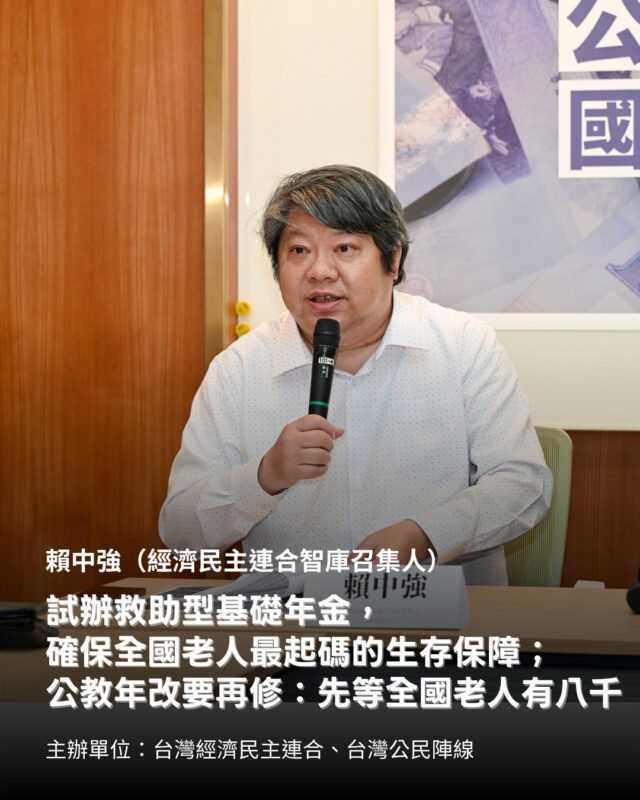 ▍賴中強:試辦救助型基礎年金,確保全國老人最起碼的生存保障;公教年改要再修:先等全國老人有八千