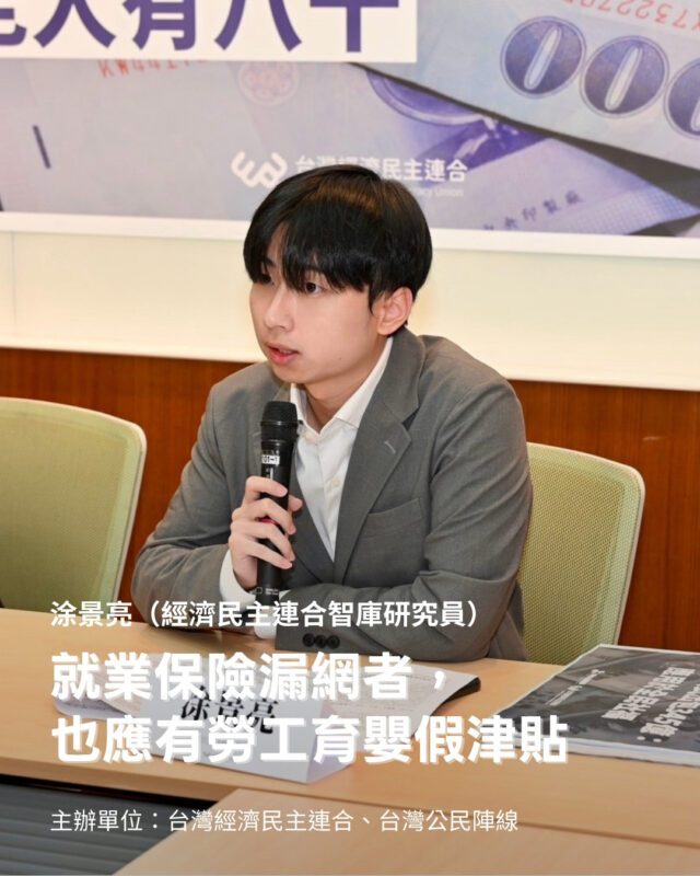 根據勞工保險局統計,2024年底,我國四人以下事業單位,投保職災保險的總人數為997,725人,投保勞工保險的總人數為759,170人,投保就業保險總人數為698,158人。台灣經濟民主連合智庫經濟與社會政策中心推估,我國四人以下事業單位,職災保險與就業保險投保人數差額高達299,567人,扣掉依法不投保就業保險的移工,並依四人以下事業單位可聘僱移工之性質應屬家庭看護工分析,2024年底家庭看護移工人數為196,744人,則光四人以下事業單位依法應投保就業保險而未投保之人數,即高達102,823人!再加計大型數位平台業者與保險業者規避投保責任等各種情形,整體而言,我國應投保就業保險而未投保之人數,估計應在三十萬人以上。行政院《育嬰留停照顧彈性化》應搭配經民連《財劃法》「試辦無論有無加入就業保險均得申請育嬰留職停薪津貼,每一子女以三十日為上限」倡議方案,方能對育兒勞工,提供完整覆蓋的社會支持。