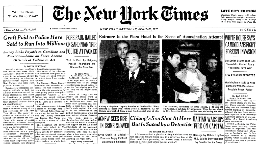 1970年4月25日美國紐約時報頭版關於黃文雄行刺蔣經國的報導(原文與中譯)