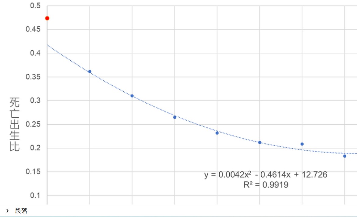 將後續幾年的「死亡出生比」繪製成圖,呈現幾乎完美的二次曲線,R平方高達0.9919。
