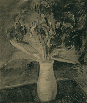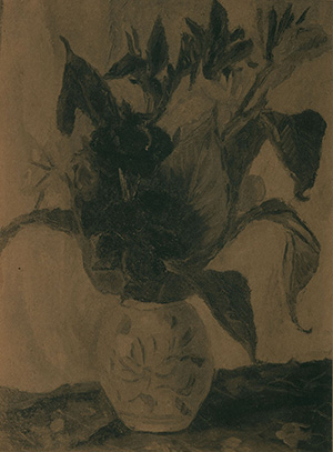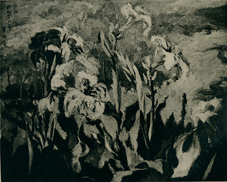 從整體臺府展西洋畫部來看,花卉畫的數量不算少,雞冠花、百合、扶桑花等都是常見的主角,以美人蕉為主題的畫作,除伊藤之作外僅有六件,如以瓶花形式呈現的木村義子〈カンナ〉(圖4)、栗山綾子〈カンナ〉(圖5),以花叢形式表現的栗林秀雄〈カンナ〉(圖6)、齋藤岩太〈カンナ〉,還有後藤俊〈カンナを持てるルバルバ(拿美人蕉的魯巴魯巴)〉(圖7)描繪手持美人蕉的原民女性魯巴魯巴(註4)等等。