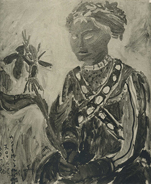 4. 後藤俊入選臺府展的畫作中,唯一以人物為題材的便是這幅〈カンナを持てるルバルバ〉,入選1940年的第三回府展。從落款「トクブン社」的註記得知為魯凱族與排灣族交會之德文部落,推測畫中拿著美人蕉的女主角可能是魯凱族人魯巴魯巴(陳阿修),其戰後與丈夫排灣族人陳俄安一同成立收藏排灣、魯凱族文物的陳俄安博物館,研究原住民工藝的畫家顏水龍也時常向她討教相關知識。參見財團法人陳澄波文化基金會,陳坤毅〈【名單之後】豆腐店裡的少年畫家——後藤俊〉,網址:https://chengpo.org/【名單之後】豆腐店裡的少年畫家-後藤俊/(瀏覽日期:2022-10-04)。