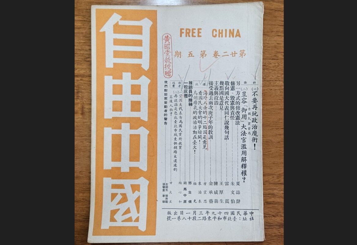 「當我今晚抄寫〔按,《自由中國》〕關於評論大法官會議解釋案的社論稿時, 內心感到很沈重。