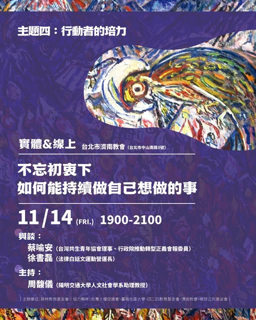 請青年工作者蔡喻安、徐書磊、林立青、葉雅欣、洪愷伶、鄒明軒,分享困難議題、社福、環境、社宅、青創等實踐經驗,讓大家了解如何跨出同溫層進行倡議、培養人才、經營健康的組織文化,以及用創新的思考與行動,推動社會改革。 歡迎實體或線上參與!一起來激盪,思索「公民行動」的無限可能!