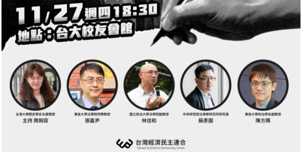 本場論壇由台灣經濟民主連合主辦,主持人為周婉窈(台灣大學歷史學系名譽教授),講者包括張嘉尹(東吳大學法學院特聘教授)、林佳和(國立政治大學法學院副教授)、蘇彥圖(中央研究院法律學研究所研究員)、陳方隅(東吳大學政治學系副教授)。經民連希望透過這場學者座談進行問題的分析,與可行方案的討論,嘗試為此重大憲政爭議問題凝聚公民社會之共識。