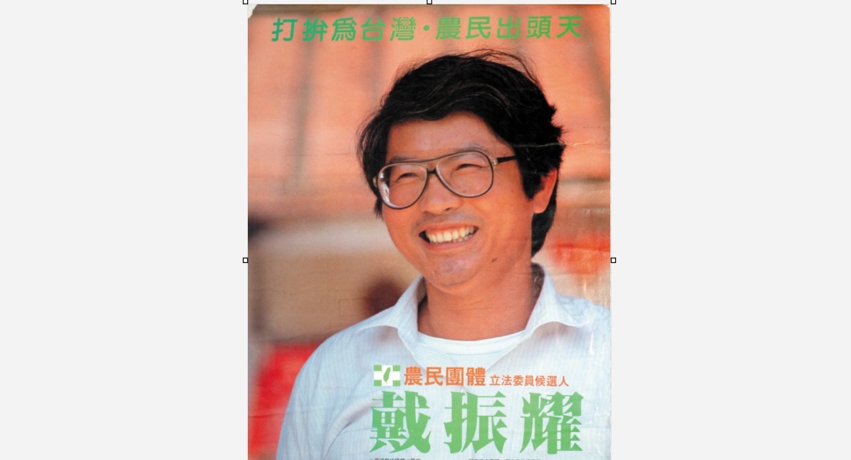 在沒有帆布輸出廣告及電視廣告的年代,我為戴振耀拍攝形象照,他只能靠印製海報四處去全國各地宣傳競選理念。戴振耀就開著那台中古裕隆車全台走透透,在農權總會的組織力動員發揮下,他可說是跌破所有選舉專家的眼鏡,1989年的立法委員選舉,為民進黨贏得一席最艱困的農民團體的立法委員。