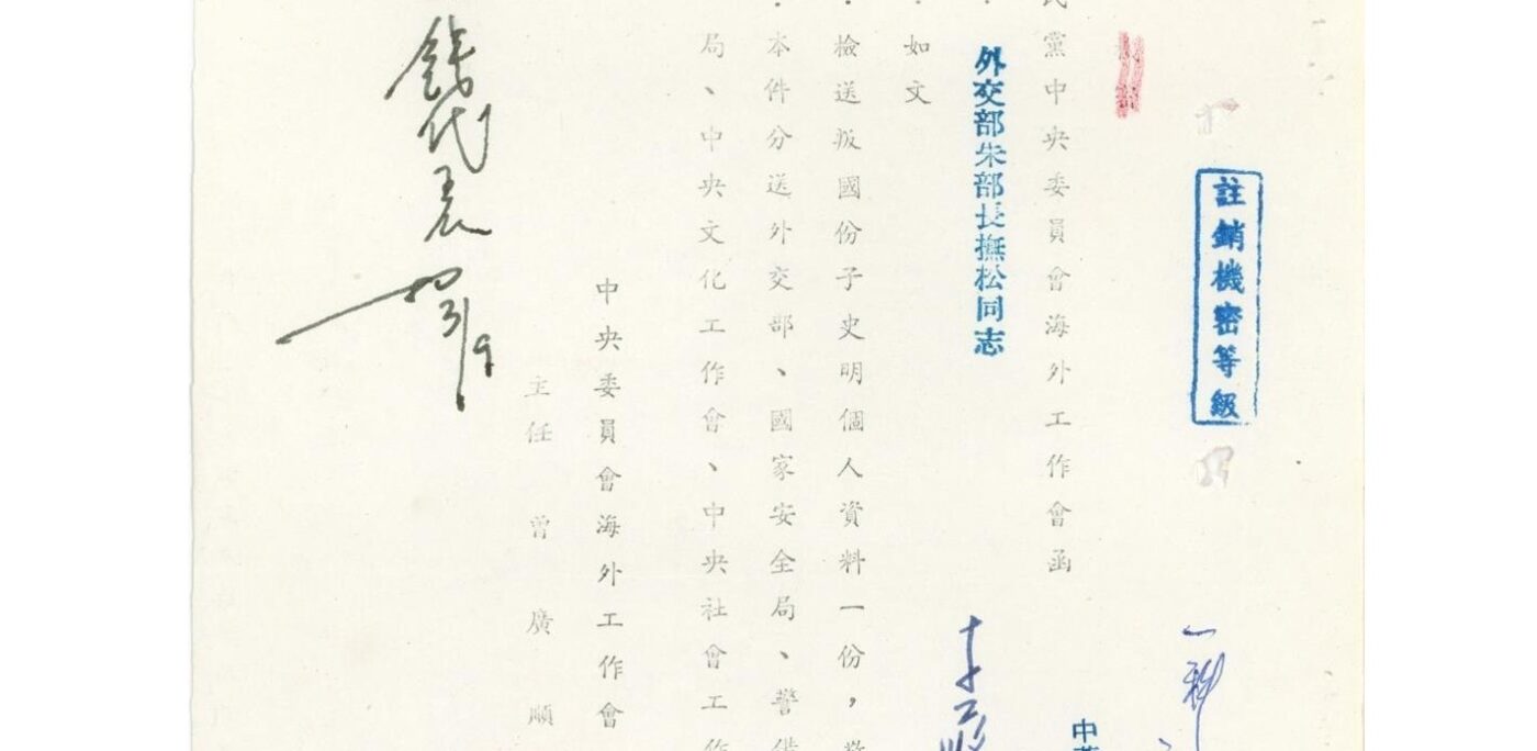 〔中國國民黨〕中央委員會海外工作會(黨)發文給外交部朱部長撫松同志(黨員稱同志),檢送「叛國份子史明個人資料一份 」。大家有沒有想過,為什麼黨的海工會手上會有「叛國」分子的個資?還會主動分送國安局、警總、新聞局參考。這張檔案顯示出「黨國體制」下的運作模式。