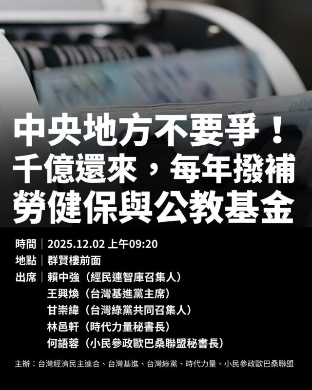 台灣經濟民主連合與台灣基進、時代力量、綠黨、小歐盟等四個政黨,將於明日上午舉行記者會,呼籲國會朝野三黨:(1)盡速協商讓《財劃法》、總預算與國防特別預算付委審查,並讓爭議盡早落幕,(2)縮減「暴增版」的統籌分配稅款與地方補助款規模,確保中央政府對勞健保與公教退撫基金四大社福財政缺口撥補,未來十年,每年有不少於一千億元的穩定財源。