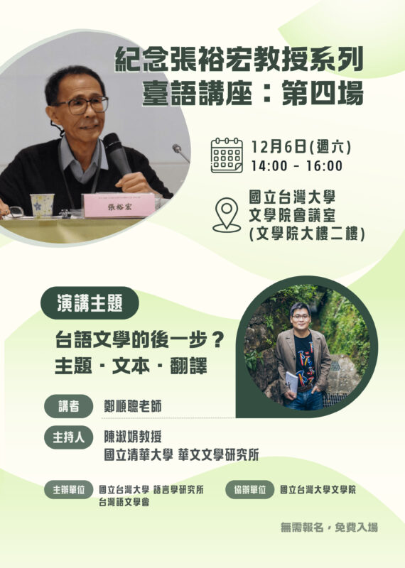 「紀念張裕宏教授系列臺語講座」:第四場 台語文學的後一步?主題.文本.翻譯/歡迎參加!!
