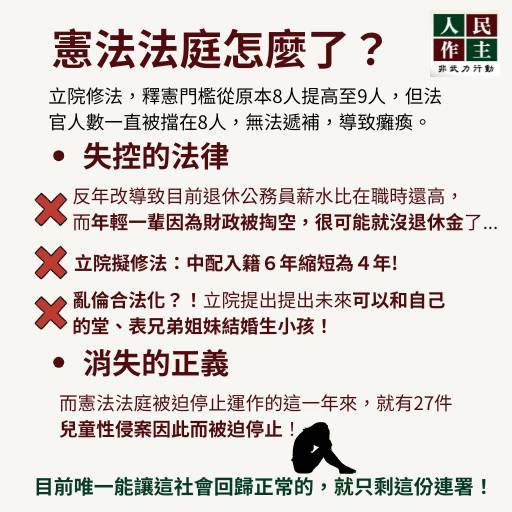 憲法法庭癱瘓的惡果正反噬著我們,而現在我們唯一能做的,就是利用電子連署,把憲法法庭救回來!只有這樣社會才能再有正義。