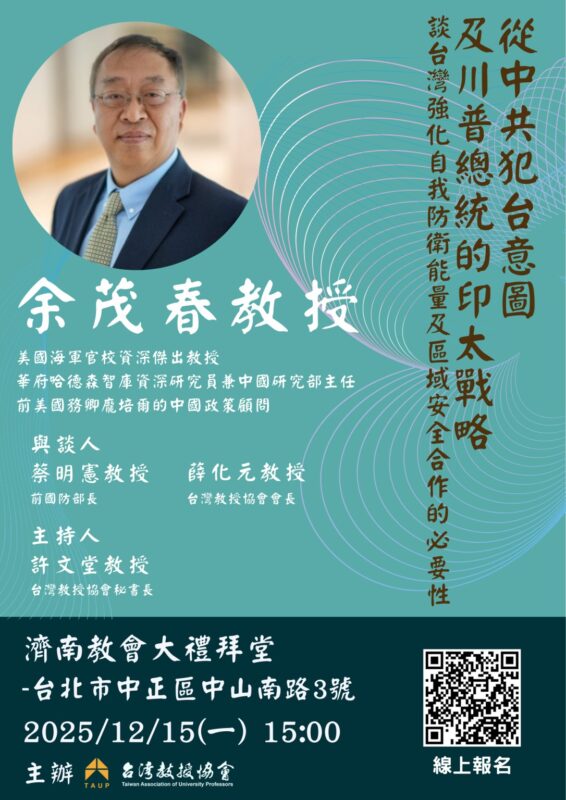 公民養成, 國家認同, 獨裁的進化與反撲, 當代台灣, 認識民主/民主防衛, 近期活動余茂春教授將於12月15日於濟南教會演講/歡迎參加!! 2025/12/082025/12/08 台灣放送 余茂春教授將於12月15日於濟南教會演講/歡迎參加!! 台灣教授協會 主辦 講題:從中共犯台意圖及川普總統的印太戰略談台灣強化自我防衛能量及區域安全合作的必要性 相關介紹如下:主講人:余茂春美國海軍官校資深傑出教授華府哈德森智庫資深研究員兼中國研究部主任前美國務卿龐培爾的中國政策顧問 主持人:許文堂台灣教授協會秘書長 與談人:蔡明憲前國防部長前國防大學國防政策及戰略講座教授國立台中科大兼任法律教授 與談人:薛化元台灣教授協會會長 台灣放送 「台灣放送」是台灣民主防衛聯盟的網站,以推廣歷史知識、深化公民教育為宗旨,目的在提供國人較為周全的資訊,以了解台灣的過去,面對當代問題,為建立穩固、自由民主不退轉的國家備好道路。 【講座紀錄】林佳和:副署並公布法律是行政院長、總統的絕對義務嗎?(全文紀錄) 【講座紀錄】張嘉尹:副署並公布法律是行政院長、總統的絕對義務嗎?(全文紀錄)