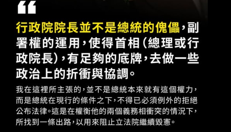 所以在這裡我只想說,基本上行政院院長並不是總統的傀儡。正因如此,副署制度還是有其意義,它不是空的。如果我們再去觀察比較憲法上的運作的話,可以發現,副署權的運用,使得首相(總理或行政院長),有足夠的底牌,去做一些政治上的折衝與協調。