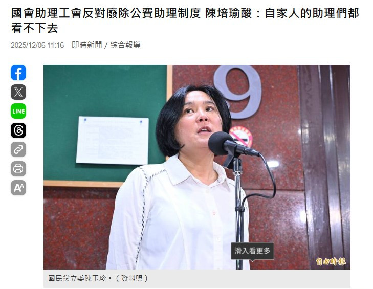 陳玉珍這種「立委助理費辦公費私有化」的修法,不僅是惡化國會助理的勞動條件,還為貪汙犯開脫,更為立委實質加薪,是百分之百的立委自肥、圖利條款。