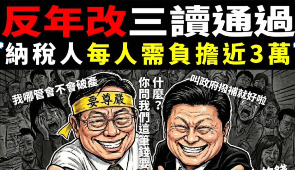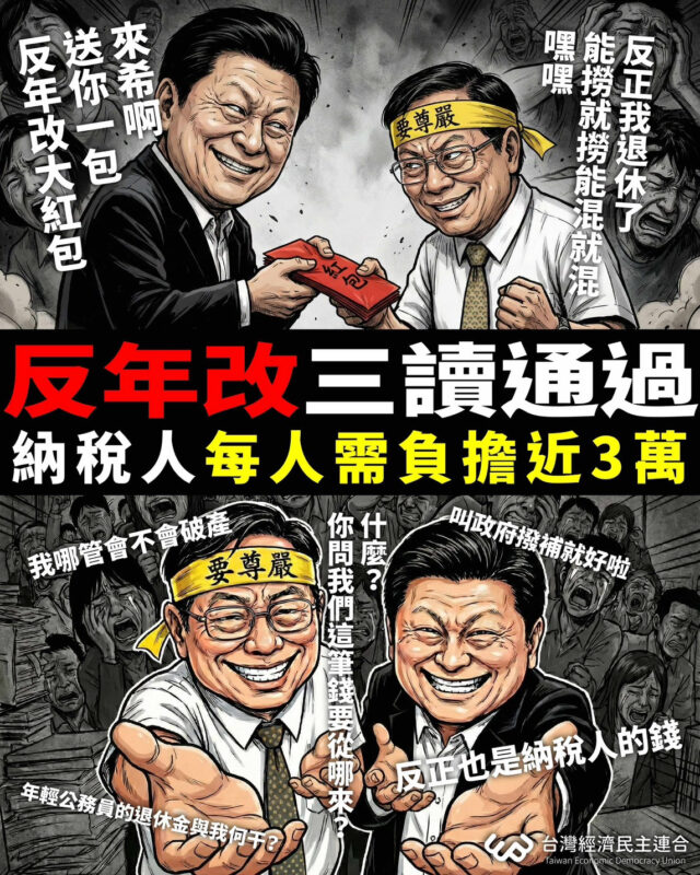 針對立法院今日所通過的反年改法案,台灣經濟民主連合痛批:在勞工平均退休金兩萬五、老農年金八千、國民年金四千的給付水準下,維持公教人員超高所得替代率的退休年金,這是職業歧視,這是世代剝削。經民連重申:對於因停止年改、年改大開倒車後所造成的新財務缺口,依法政府不負撥補義務,也不應由納稅人負擔。