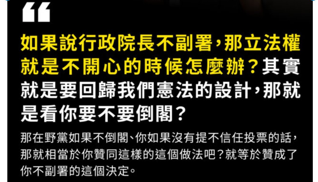 那如果說行政院長不副署,那立法權就是不開心的時候怎麼辦?其實就是要回歸我們憲法的設計,那就是看你要不要倒閣?那在野黨如果不倒閣、你如果沒有提不信任投票的話,那就相當於你贊同這樣的這個做法吧?就等於贊成了你不副署的這個決定。