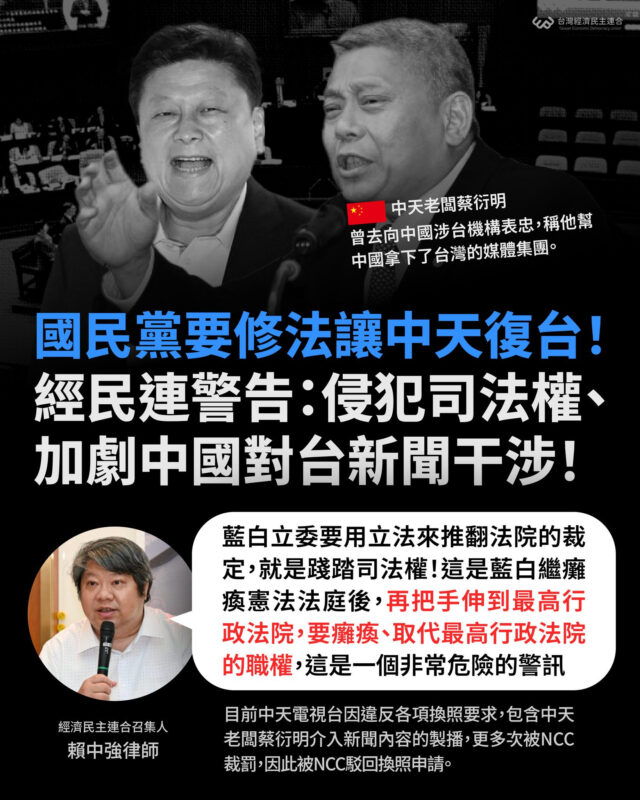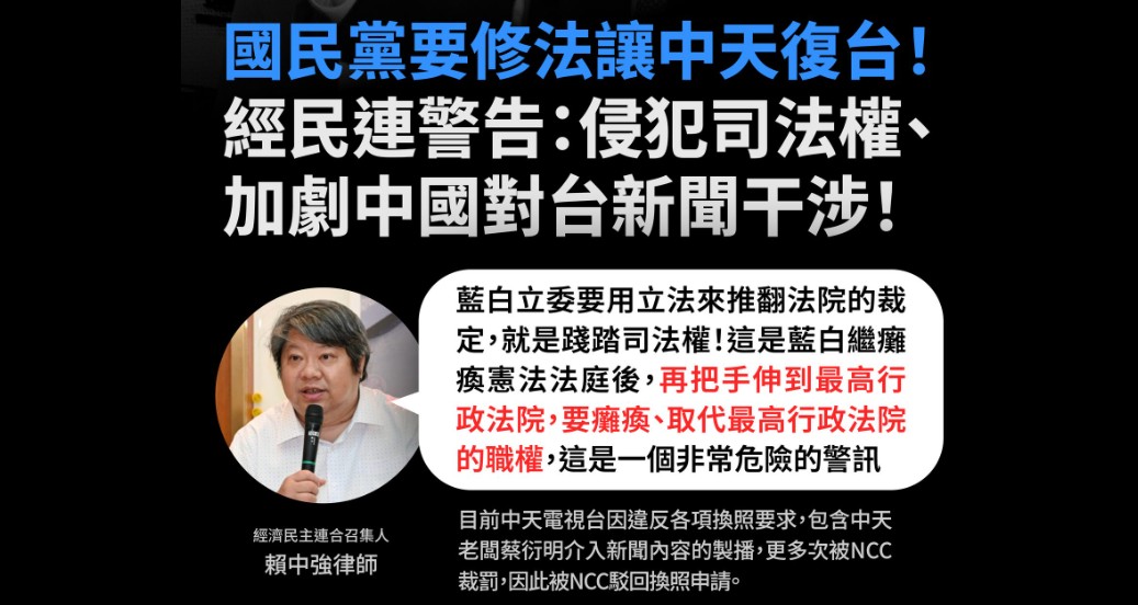 國民黨團在上週五行政院會將「中天條款」逕付二讀,欲讓中天復台。經民連智庫召集人賴中強今受訪時警告,中天申請換照被NCC駁回後,提起行政訴訟又被台北高等行政法院駁回,國民黨提此修法讓中天復台,是用立法權侵犯司法權,更恐讓中國對台的新聞干涉、認知作戰加劇。