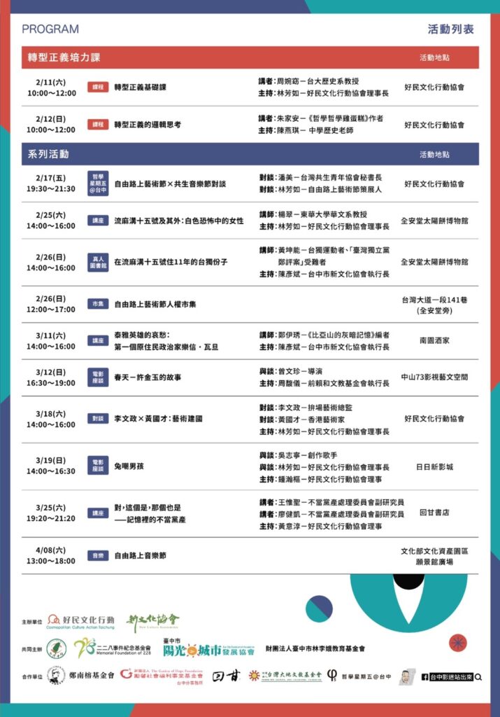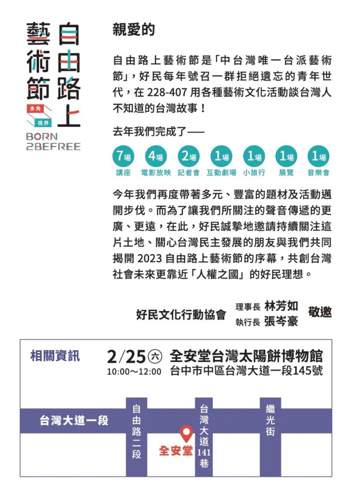 活動回顧二二八紀念活動:好民文化行動協會 2023/02/142023/03/11 好民文化行動 二二八紀念活動:好民文化行動協會 好民文化行動 好民文化行動是紮根台中的市民倡議團體。 我們舉辦自由路上藝術節、好民請願運動、好國好民講座,集結更多年輕夥伴共同深化台灣民主社會。 二二八紀念活動:台灣基督長老教會 二二八紀念活動:台灣國家聯盟