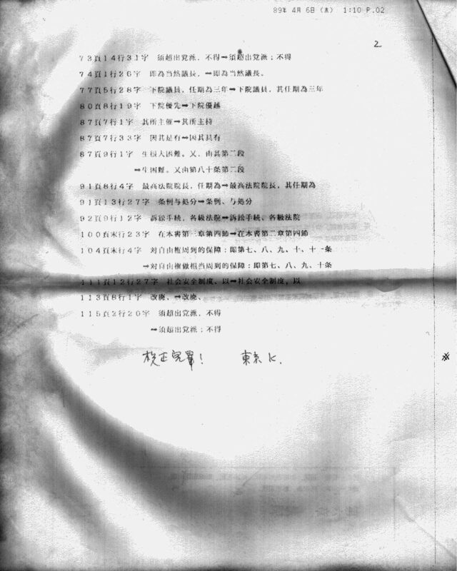 附圖的傳真,是最好的證明。這是4月6日(不確定清晨或中午)1點時,許世楷教授從東京傳來的傳真,內容是《台灣未來的描繪》的稿件校正,末尾K是他的簽名。從1988年12月刊出〈台灣共和國新憲法草案〉後,鄭南榕與許世楷持續透過電話和信件往來討論下一本出版品的計畫。