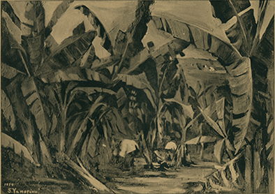 繪製一幅畫作,不像現代攝影般便利。畫家多會在思考構圖後,才確認下筆。但若是觀看山際茂的作品歷程,從〈芭蕉園〉首次入選臺展過後,歷經九年,山際茂的繪畫主題卻逐漸在畫裡消失?〈芭蕉園〉給了觀者明確的芭蕉園景象,〈山麓の家〉中代表家的房舍,被遮掩在龍舌蘭科植物的花穗後面,直到〈裏窗より眺む〉視線一時失了焦點,不知該先看什麼才好。