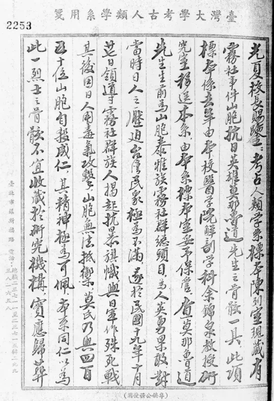 光夏校長賜鑒:考古人類學系標本陳列室現藏有霧社事件山胞抗日英雄莫那魯道先生之骨骸一具,此項標本係去年由本校醫學院解剖學科余錦泉教授研究室移送本系,由本系標本室妥予保管。查莫那魯道先生生前為山胞泰雅族霧社群總頭目,為人英勇果敢,對當時日人之壓迫台灣民眾極為不滿,遂於 民國十九年十月廿七日 領導霧社群族人揭起抗暴旗幟,與日軍作殊死戰,其後因日人用毒氣攻擊,山胞無法抵禦,莫氏乃與四百五十位山胞自殺成仁,其精神極為可佩。本系同仁以為此一烈士之骨骸不宜收藏於研究機構,實應歸葬於其故鄉,建立墓園,以供後人瞻仰。茲謹建議