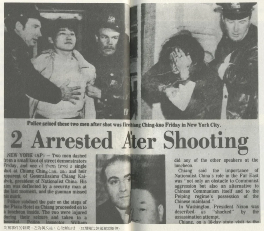 這個做法需要一點解釋。前文說過,我認為雖然必須使用武器,但暗殺的動作還是個政治行為。如果誤傷無辜,即使技術上暗殺成功,必然會傷害此舉的政治意義,對運動有害。可是要避免傷及無辜,必須儘量接近對象,而接近對象也就是接近對象的衛護人員,這是個政治難題,不是只須考慮技術的好萊塢電影。因為為前述多跑半條街造成的延遲,我接近時他正在旋轉門外,即將進入,可以說是最後一秒的機會。沒預料到的是,我開第一槍的時候,一個機警的紐約警官(detective)看到了,飛身而起把我的手肘往上托,子彈飛向蔣經國頭部上方。我開第二槍時,蔣經國已經進入旋轉門的右側了。而我也被一大「堆」警察壓在地下。這時,場面變得有點「鬧劇化」。我個子小,可以從那些彪形大漢的身體間鑽出頭部或上半身來。每一次這樣時,便會有其他警察飛身壓在我身上。我相信是這個場景,使本來在示威隊伍中發傳單的鄭自才一時衝動,跳進來救我。雖然這不是理性的做法,他出自衷心的關懷,還是非常感人。(在此附帶一筆,有些報導說,他身上帶著刀,這是沒看法庭文件的編造。)