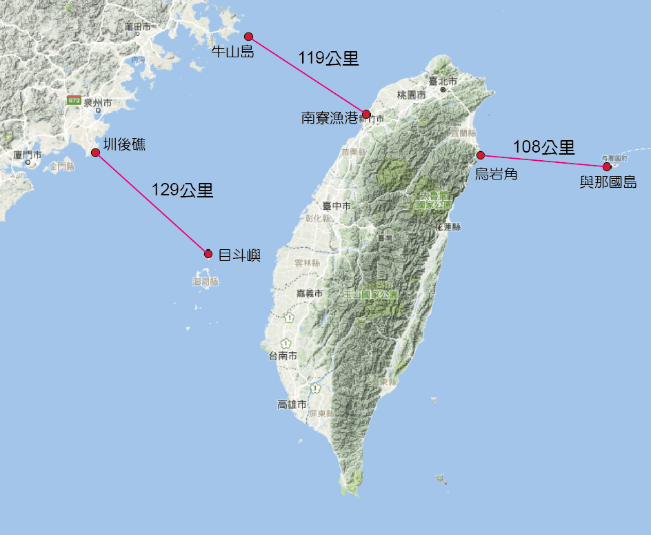 日本領土與臺灣島的最短距離是108公里(與那國島至蘇澳的烏岩角);中國領土與臺灣島的最短距離是119公里(平潭縣的牛山島至新竹的南寮漁港)。若無人島不算,中國與臺灣島的最短距離是127公里(平潭島至南寮漁港)。