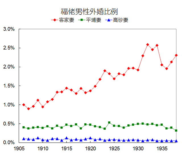 上圖顯示平埔男性與其他族群女性結婚的比例。相較於福佬人或客家人,平埔族人選擇族群外婚的比例較高,從 1906 年的 20% 左右逐漸上升到 1938 年的三分之一。這個趨勢也反映:在 19 世紀或更早之前,平埔族與漢人通婚的比例可能低於 20%。