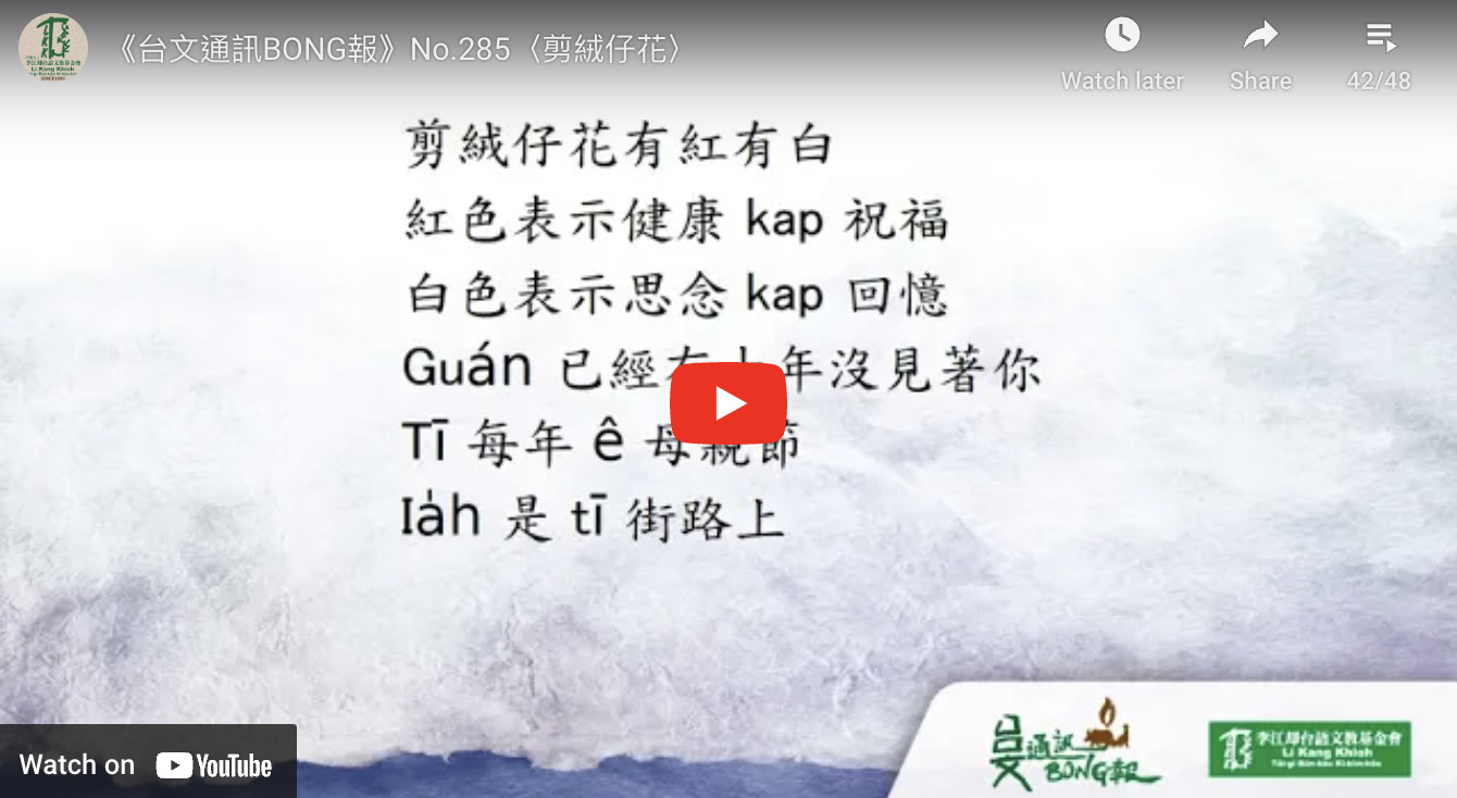 台語, 母語學習《台文通訊BONG報》No.285〈剪絨仔花〉 2023/07/31 李江却台語文教基金會 《台文通訊BONG報》No.285〈剪絨仔花〉 李江却台語文教基金會 李江却台語文教基金會 戰爭與文化 《台文通訊BONG報》No.290〈Gōng gōng等〉