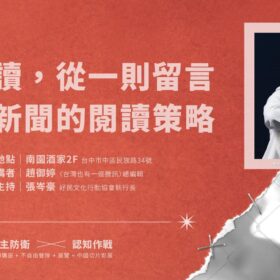 講座最後,曾柏瑜也分享當初在台灣民主實驗室和黑熊學院所講授面對資訊認知作戰的經驗與看法。面對中共極權透過社群媒體來認知作戰的資安問題,解法除了在日常培養我們對於媒體訊息的真偽識讀辨別能力外,也必須仰賴第四權—也就是傳媒、報章新聞媒體與自媒體的自律與合作,來揭穿資訊戰的假消息源頭及拆穿認知作戰操作腳本,讓這些統戰陰謀論的自己露出馬腳!