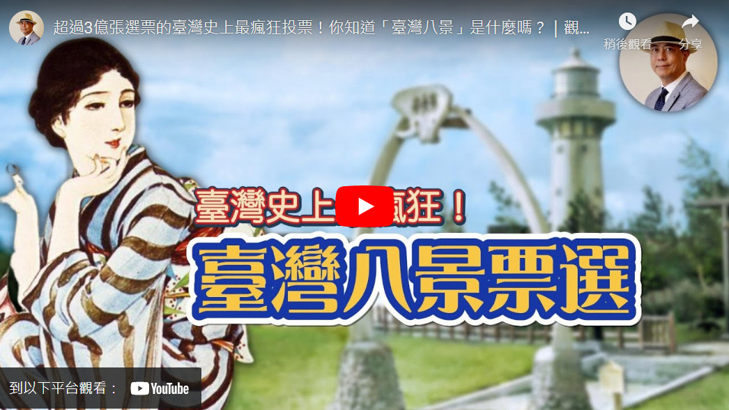 日治時期, 短片劇場超過 3 億張選票的臺灣史上最瘋狂投票!你知道「臺灣八景」是什麼嗎? 2023/09/022023/09/02 王佐榮 超過 3 億張選票的臺灣史上最瘋狂投票!你知道「臺灣八景」是什麼嗎? 王佐榮/佐榮寫真館 2023/08/30 歡迎來到有圖有真相的「佐榮寫真館」!今天我們要介紹臺灣史上,既空前又絕後、最瘋狂的全民運動——「臺灣八景票選活動」。 特別感謝聚珍臺灣提供手繪上色照片~📷 王佐榮 是廣告人,也是老師、YouTube頻道「佐榮寫真館」主持人;長期於輔仁大學擔任助理教授。著有《李火增攝影集系列》、《鄧南光攝影集系列》《帝國•臺灣》、《東宮行啟》、《來去滿洲》、《百年戰疫》等日治史書籍十餘冊。 【帝都玄關】浴火重生的日本最華麗車站!東京車站如何保存至今? 悼念 蔡焜霖 前輩(1930-2023)