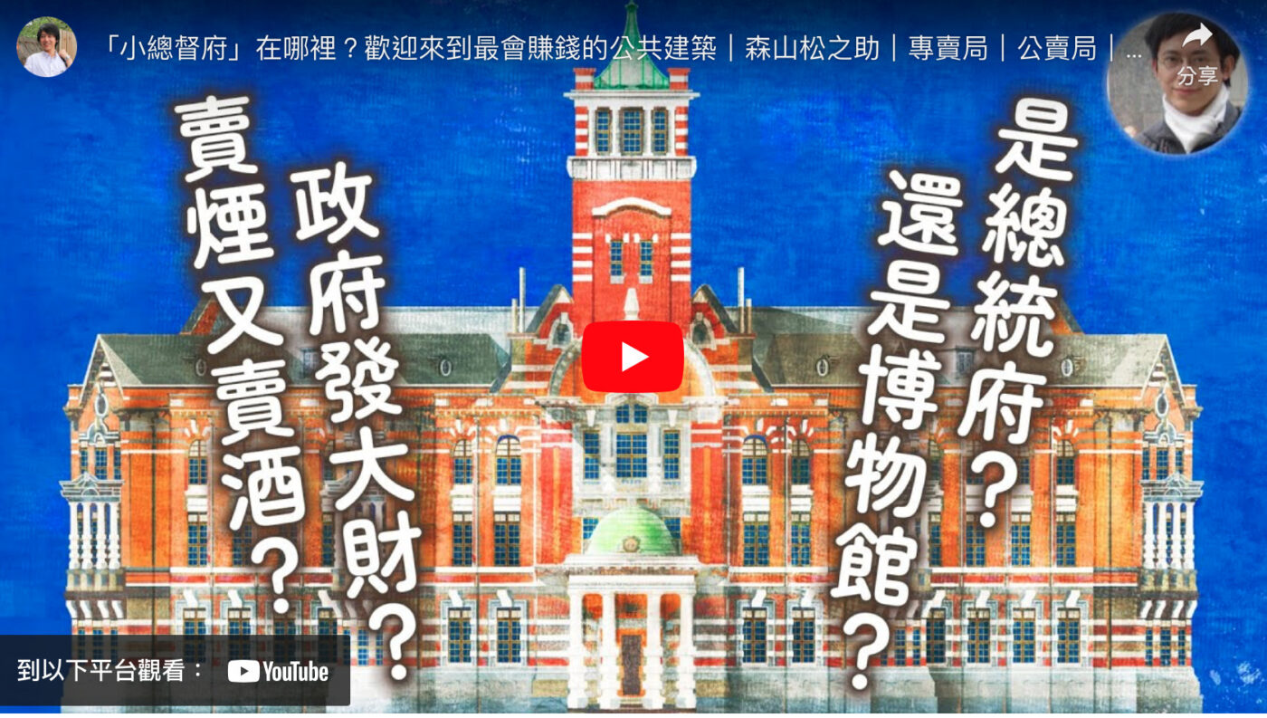 台灣歷史, 日治時期, 短片劇場「小總督府」在哪裡?歡迎來到最會賺錢的公共建築 2023/10/142023/10/26 凌宗魁 「小總督府」在哪裡?歡迎來到最會賺錢的公共建築 凌宗魁 歡迎來到凌宗魁聊建築。大家經過臺北南門附近有發現一座小小的紅色塔樓嗎?這是負責專賣制度業務的總督府專賣局,為何會蓋在那裡?和周邊環境有什麼關聯?首先要從在它旁邊的工廠開始說起。 封面繪圖:鄭培哲 00:00 開場00:26 專賣制度的核心 01:37 紅樓與小白宮 03:39 宛如總督府的外觀 06:00 華麗的內部裝飾 (影片轉載自:凌宗魁聊建築 2023/10/12 影片) 凌宗魁 博物館員,建築史與文化資產研究工作者,致力尋找各種藝術載體中的台灣建築故事。 臉書:https://www.facebook.com/PRHA1008 以巴衝突》哈瑪斯的突擊 印證「以色列模式」不是烏克蘭的榜樣 【連署】 堅定台灣民主前行 避免威權復辟 跨世代連署要求完成轉型正義五法修法