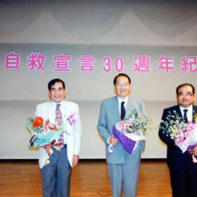 1988年8月19日到21日,世台會成功返台舉辦。第一次在台北縣新店燕子湖舉辦第15屆年會,主題是「台灣人的生命尊嚴與再生」,我負責世台會文宣設計。