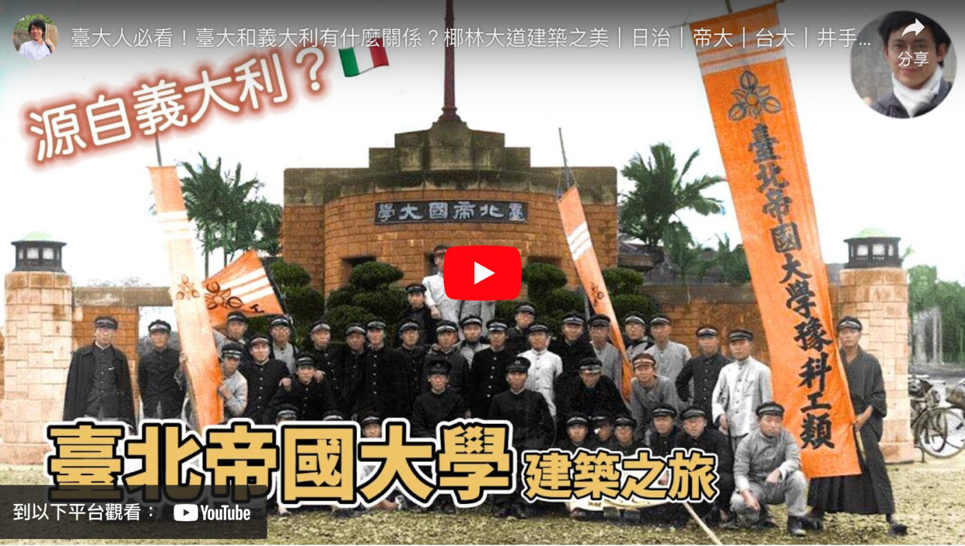 台灣歷史, 日治時期, 短片劇場臺大人必看!臺大和義大利有什麼關係?椰林大道建築之美 2024/02/13 凌宗魁 臺大人必看!臺大和義大利有什麼關係?椰林大道建築之美 凌宗魁 目前臺灣有一百多間大學,在少子化的時代幾乎人人有大學可以念,可以說是高教之國。各位知道臺灣最早的大學是哪間嗎?今天來聊聊臺北帝國大學的經典建築。 00:00 開場 00:25 在臺北帝大之前 01:42 「臺灣」帝國大學? 02:48 行政大樓歷久彌新 04:08 大門為何歪一邊? 05:55 為何種椰子? 06:50 椰林大道建築群 10:16 機能性建築 (影片轉載自:凌宗魁聊建築 2024/2/1 影片) 凌宗魁 博物館員,建築史與文化資產研究工作者,致力尋找各種藝術載體中的台灣建築故事。 臉書:https://www.facebook.com/PRHA1008 歷史上的2/13 台灣國寶畫家廖繼春逝世日 為何1992才是台灣自由民主化的開始,而不是1987?