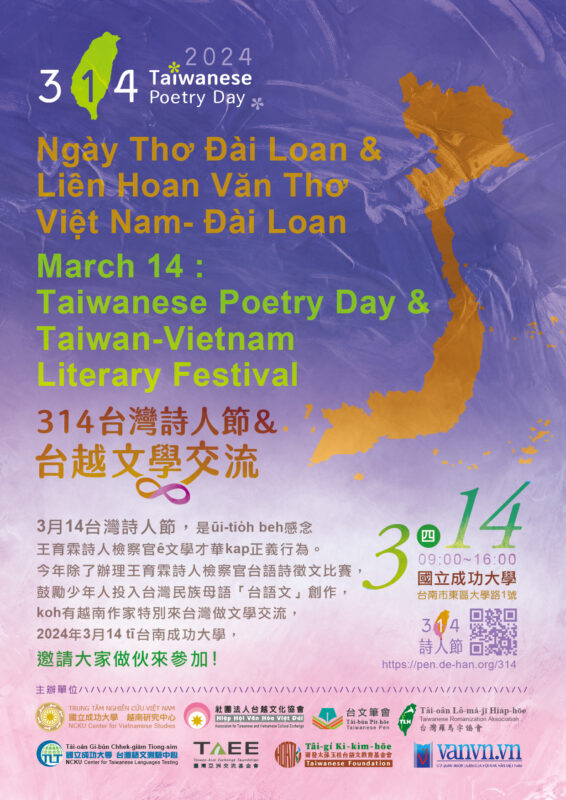 活動回顧歡迎參加2024年台灣詩人節系列活動:3月14 台灣-越南文學國際交流 2024/02/172024/03/31 台灣放送 歡迎參加2024年台灣詩人節系列活動:3月14 台灣-越南文學國際交流 3月14 台灣-越南文學國際交流 地點:成大台文系館Ngày Thơ Đài Loan & Liên Hoan Văn Thơ Việt Nam – Đài Loan 文章轉載自:台文筆會文章 台灣放送 「台灣放送」是台灣民主防衛聯盟的網站,以推廣歷史知識、深化公民教育為宗旨,目的在提供國人較為周全的資訊,以了解台灣的過去,面對當代問題,為建立穩固、自由民主不退轉的國家備好道路。 紀念林茂生教授國際研討會kap台灣教師節賀卡設計比賽頒獎典禮 3月16 王育霖詩人檢察官開像追思會kap台語詩比賽頒獎