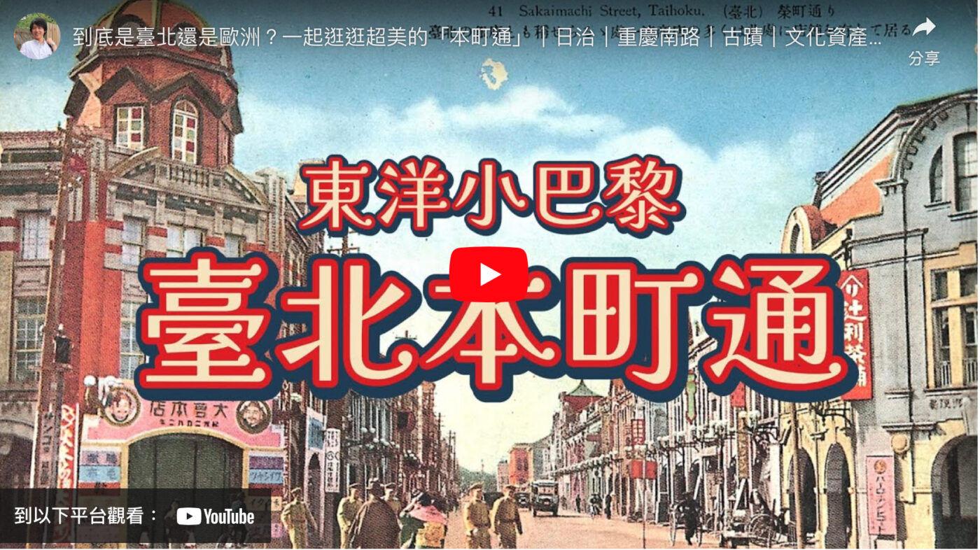 台灣歷史, 日治時期, 短片劇場到底是臺北還是歐洲?一起逛逛超美的「本町通」 2024/03/08 凌宗魁 到底是臺北還是歐洲?一起逛逛超美的「本町通」 凌宗魁 歡迎來到凌宗魁聊建築。早年以書街聞名的重慶南路,自清代臺北建城以來就已存在,隨著這座城市成長而發展,期間也不斷被賦予各種不同的名稱與任務。今天來和大家聊聊重慶南路的前身「本町通」的經典建築,為了便於理解,我也會在描述的時候使用今日的道路名稱。 00:00 開場 00:32 從府前街到本町通 04:00 「樂天地」與二二八 09:40 象徵文明開化的路口 (影片轉載自:凌宗魁聊建築 2024/3/7 影片) 凌宗魁 博物館員,建築史與文化資產研究工作者,致力尋找各種藝術載體中的台灣建築故事。 臉書:https://www.facebook.com/PRHA1008 太陽花運動十週年晚會 77年前的3/8 KMT黨國援軍開抵基隆