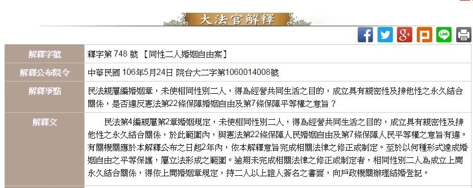 2017司法院憲法法庭舉辦公開言詞辯論;第748號解釋文,裁定民法無法保障同性婚姻為違憲