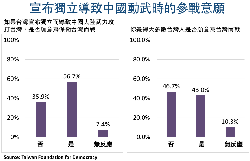 首先,如果是台灣宣布法理獨立引起的中國侵略,有56.7%的人回答願意為台灣而戰。如果是中國主動武統的狀況,則有68.1%的人回答願意為台灣而戰。