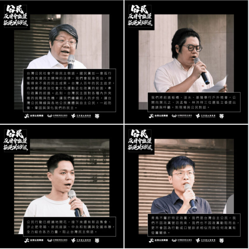 今日,我們正式宣布板橋、淡水、基隆的集會行動,將分別於週五(14)、週六(15)、週日(16)的晚間在三地舉行,也邀請葉元之、洪孟楷、林沛祥三位選區立委來到現場和群眾對話。
