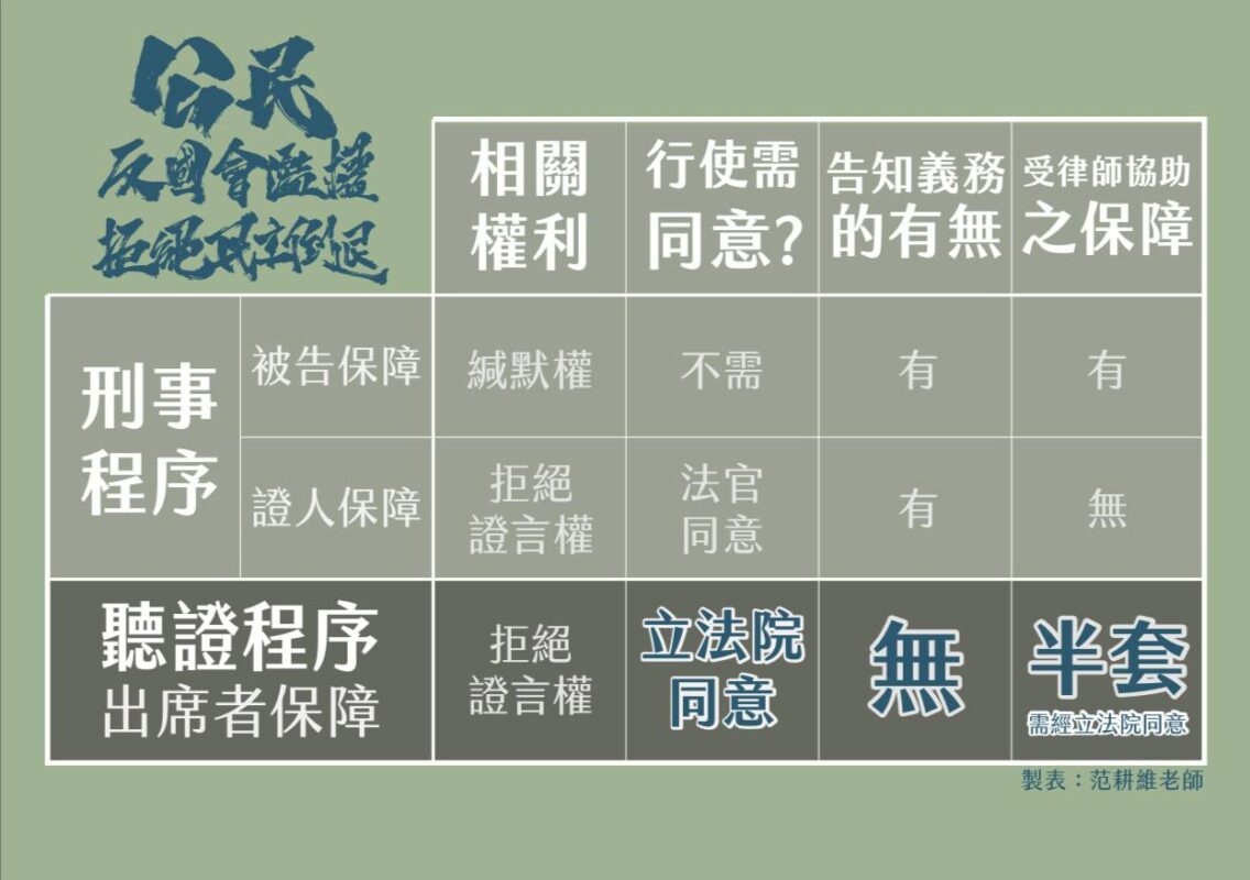 公民養成, 國家認同, 活動回顧, 獨裁的進化與反撲, 當代台灣, 認識民主/民主防衛國立東華大學法律學系范耕維老師整理 – 立院聽證程序及刑事程序比較 2024/06/162024/12/15 台灣經濟民主連合 國立東華大學法律學系范耕維老師整理 – 立院聽證程序及刑事程序比較 經濟民主連合 國立東華大學法律學系范耕維老師,將司法訴訟中的刑事程序被告與證人保障、以及本次立法院職權行使法聽證程序出席者保障,整理為精簡易懂的表格。歡迎各位下載使用!范耕維老師講義下載|https://drive.google.com/……/11ZpsO1ltYP……/view…… (文章轉載自:經濟民主連合 2024/6/16 臉書文章) 台灣經濟民主連合 經濟民主連合(簡稱經民連)誕生於反服貿、太陽花運動,致力抵抗中國政商勢力,防衛台灣民主,守護台灣主權與經濟自主,追求自由、平等、團結、永續的新國家。 𝟔𝟏𝟗 − 𝟔𝟐𝟏 公民反國會濫權 重返立法院集結 國眾兩黨 一直在造謠!!